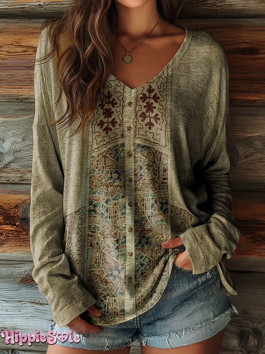 Women's Retro Ethnic Pattern Artistic Print Casual V-Neck Long-Sleeved T-Shirt