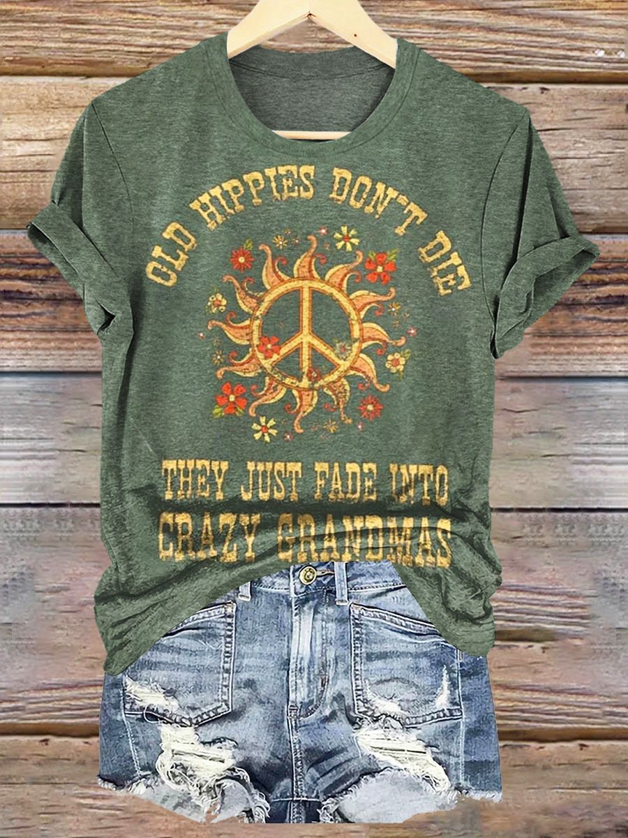 Women's Old Hippies Don't Die They Just Fade Into Crazy Grandmas Print Crew Neck T-shirt