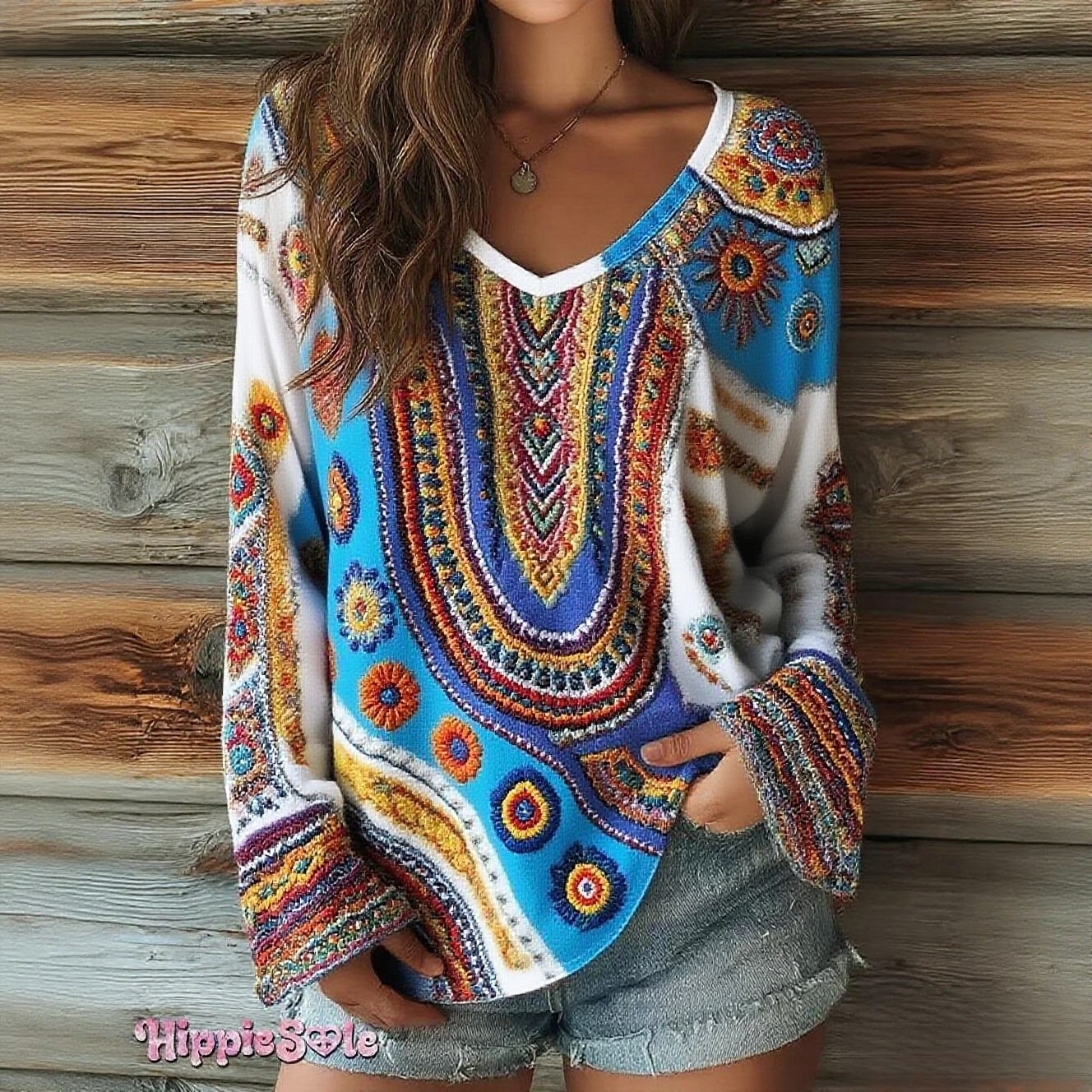 Women's Patchwork Floral Pattern Artistic Print Casual V-Neck Long Sleeve Top