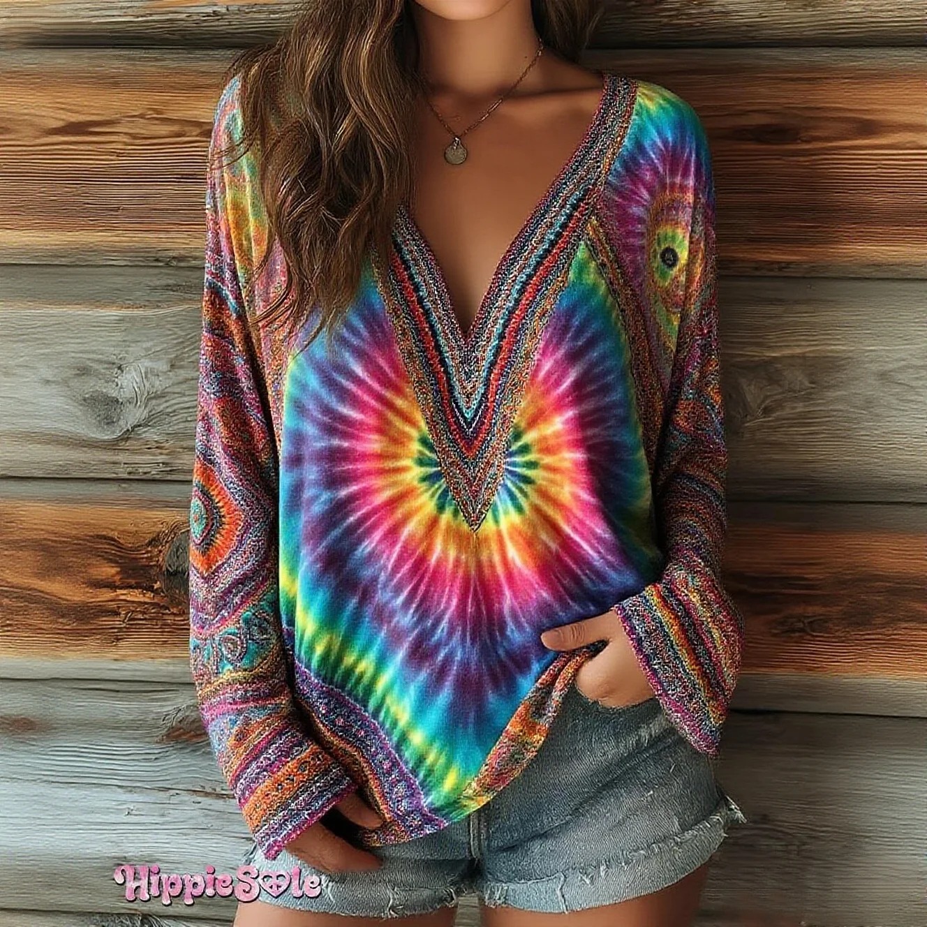Women's Striped Art Print Casual V-Neck Long Sleeve Top