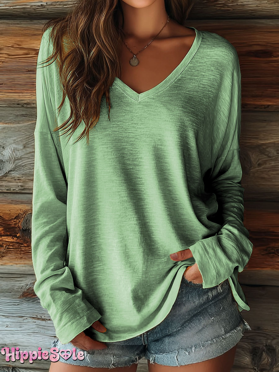 Women's Solid Color V-neck Long Sleeve Casual Cotton T-shirt
