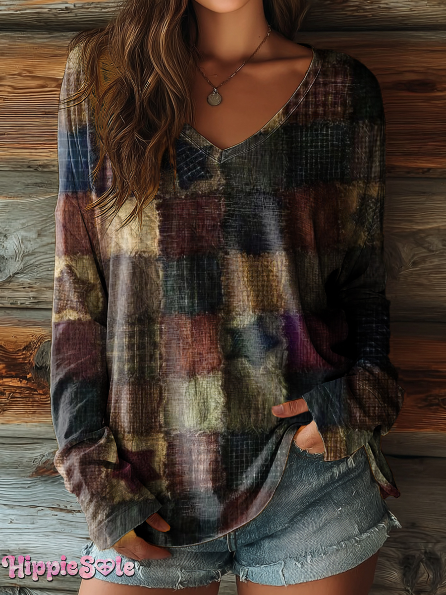 Women's Vintage Patch Art Print Casual V-neck Long Sleeve T-shirt