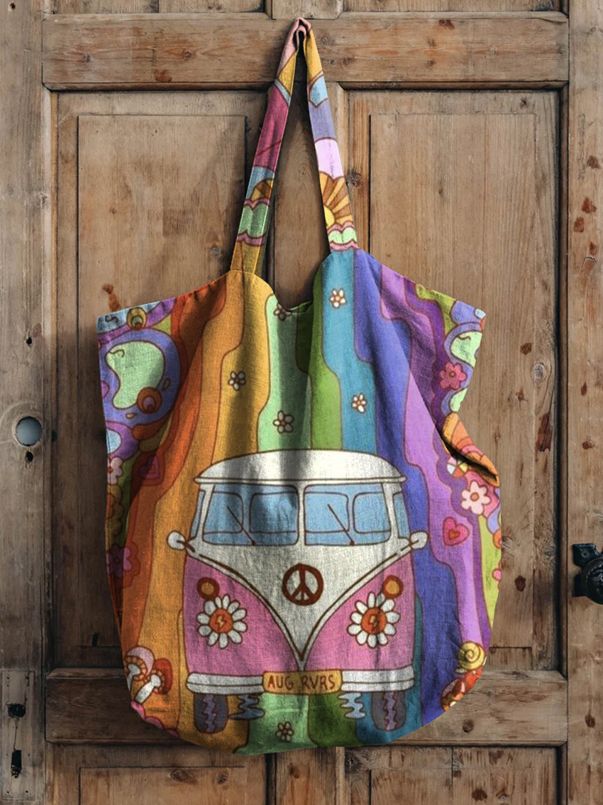 Colorful Hippie Van Rainbow Print Linen Tote Bag