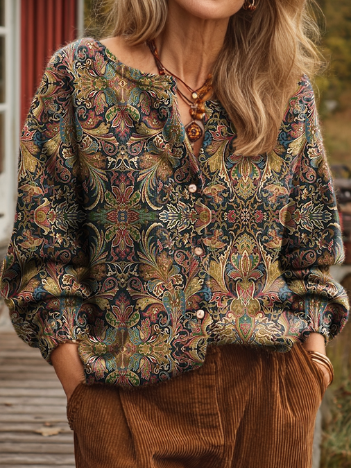 Ladies Vintage Ethnic Floral Art Prints Casual Buttons Knit Cardigan Jacket