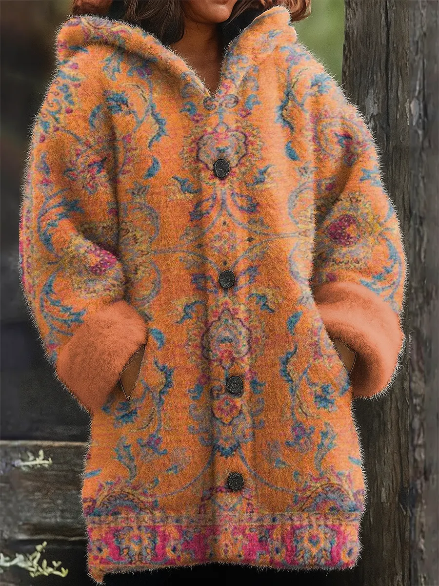 Women's Ethnic Totems Print Fleece Hooded Pocket Thick Coat