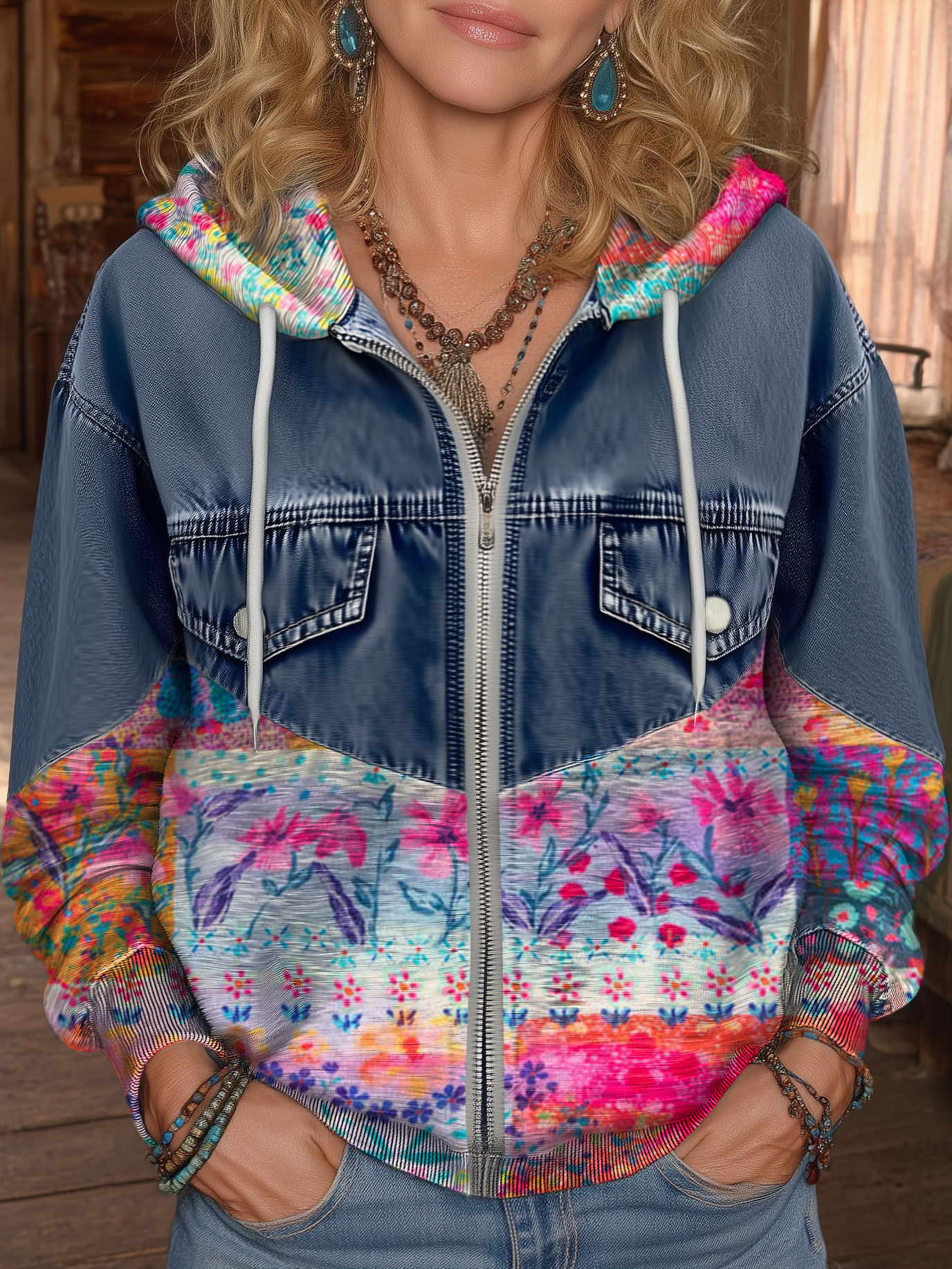 Women's Retro Colorful Floral Art Print Denim Patchwork Hooded Sweatshirt Jacket