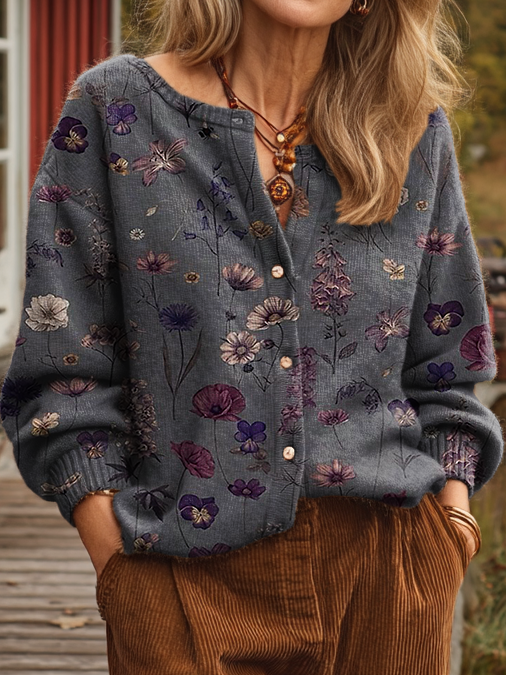 Women's Vintage Dark Gray Floral Art Print Casual Button Knit Cardigan Jacket
