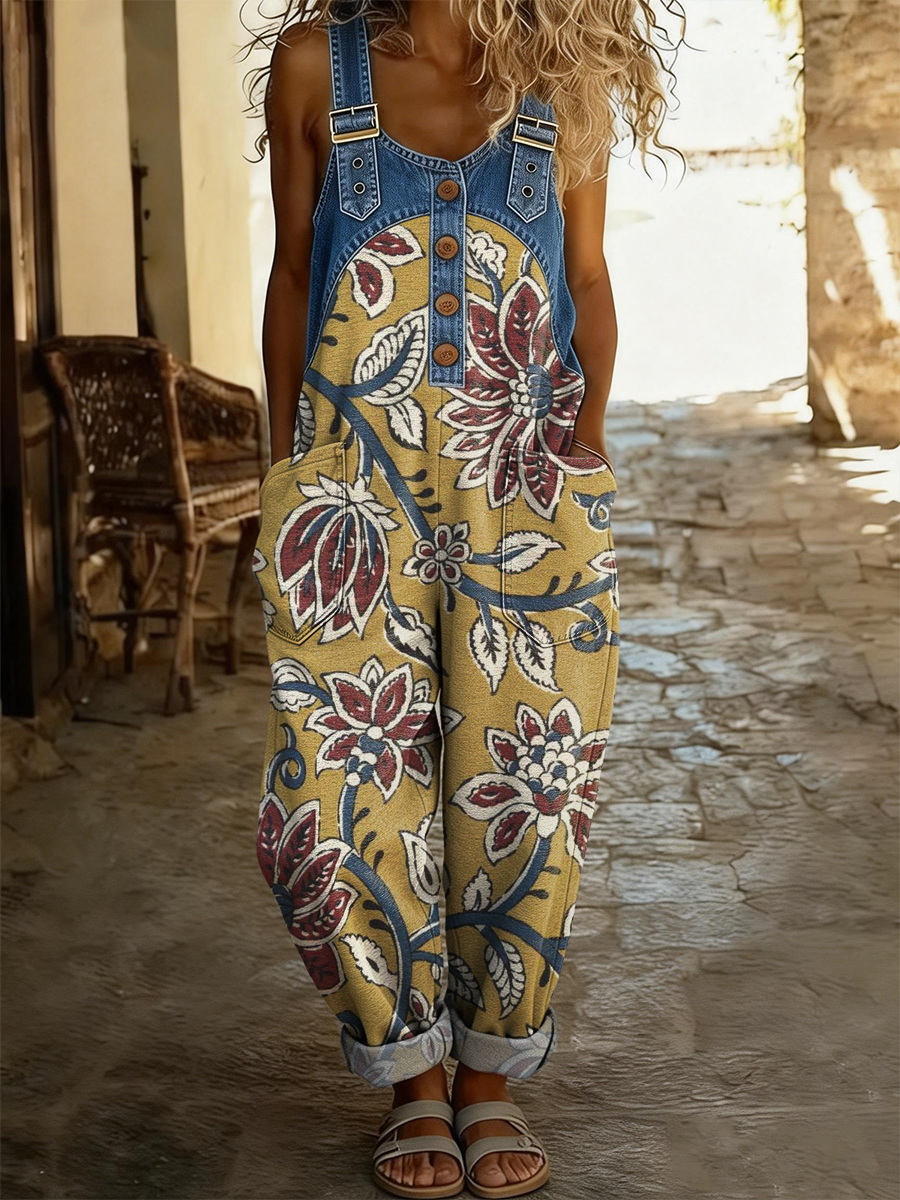 Women's Retro Bohemian Floral Art Print Casual Sleeveless Denim Patchwork Jumpsuit
