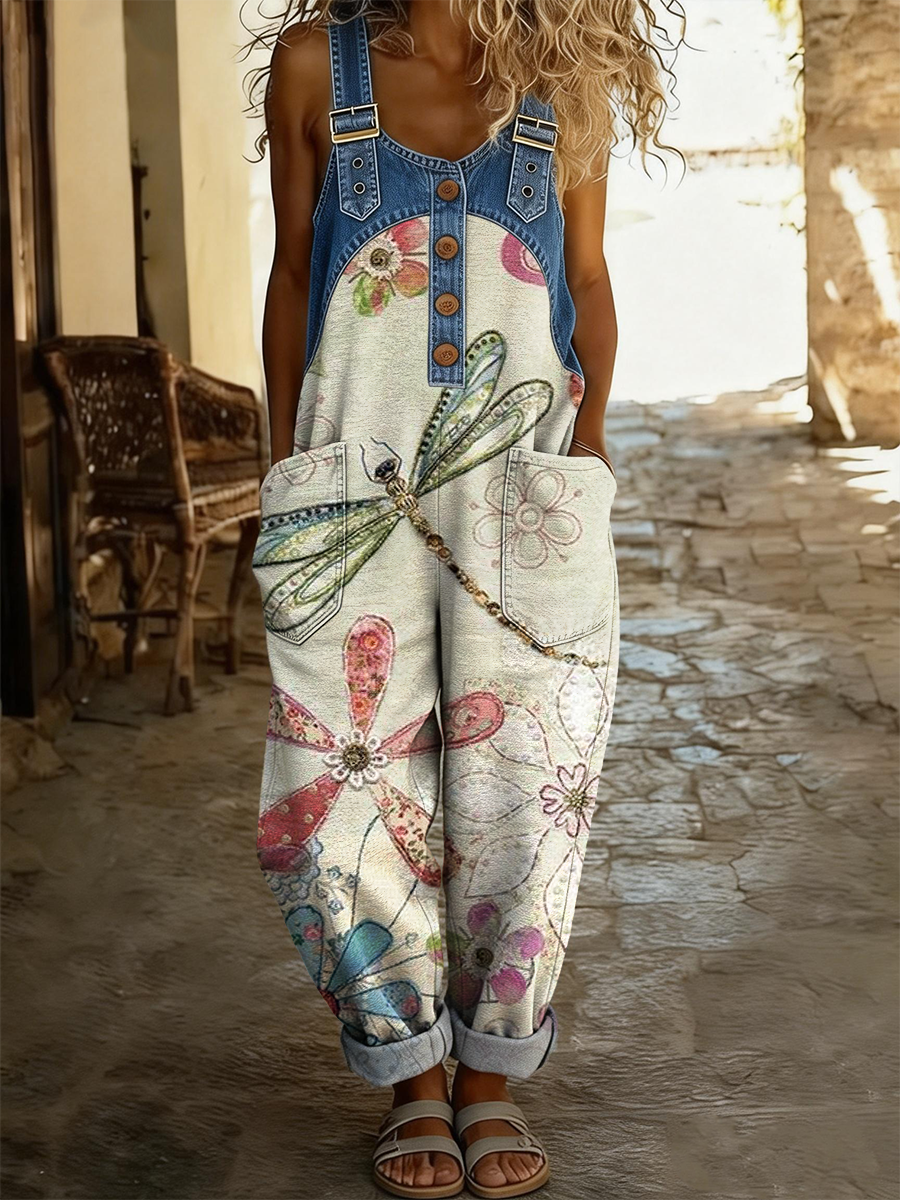 Women's Retro Dragonfly And Floral Art Print Casual Sleeveless Denim Patchwork Jumpsuit