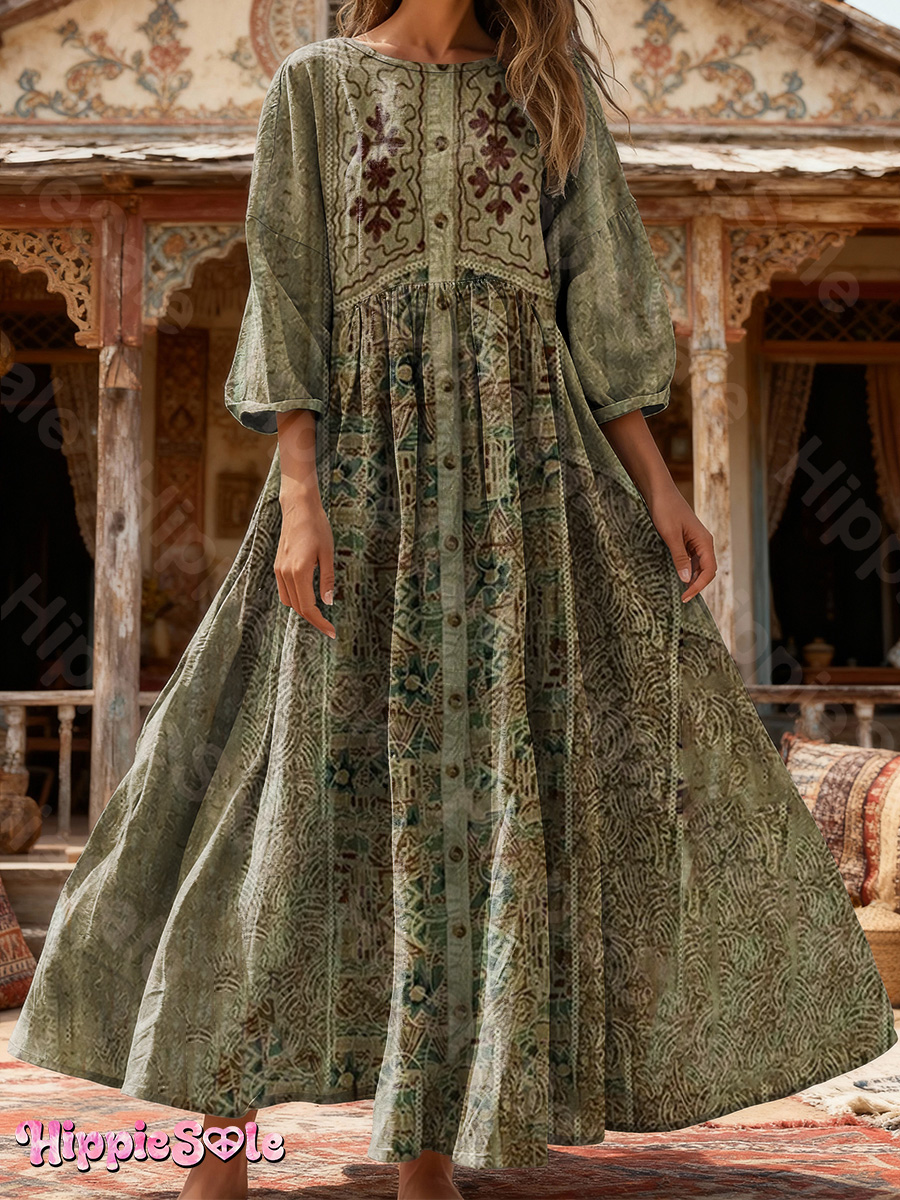 Women's Ethnic Pattern Art Print Flowing Cotton Crew Neck Dress