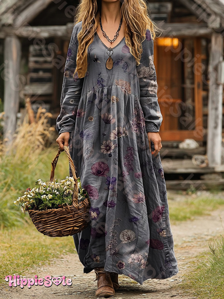 Women's Poppy Art Print Long-Sleeve Cotton Dress