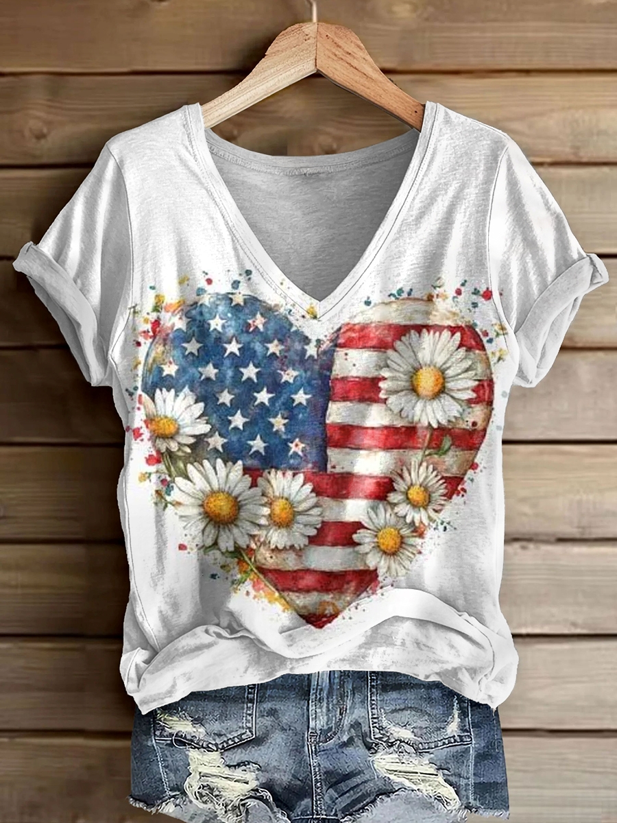 Women's Independence Day Daisy Flag Print Casual V-Neck Cotton T-Shirt