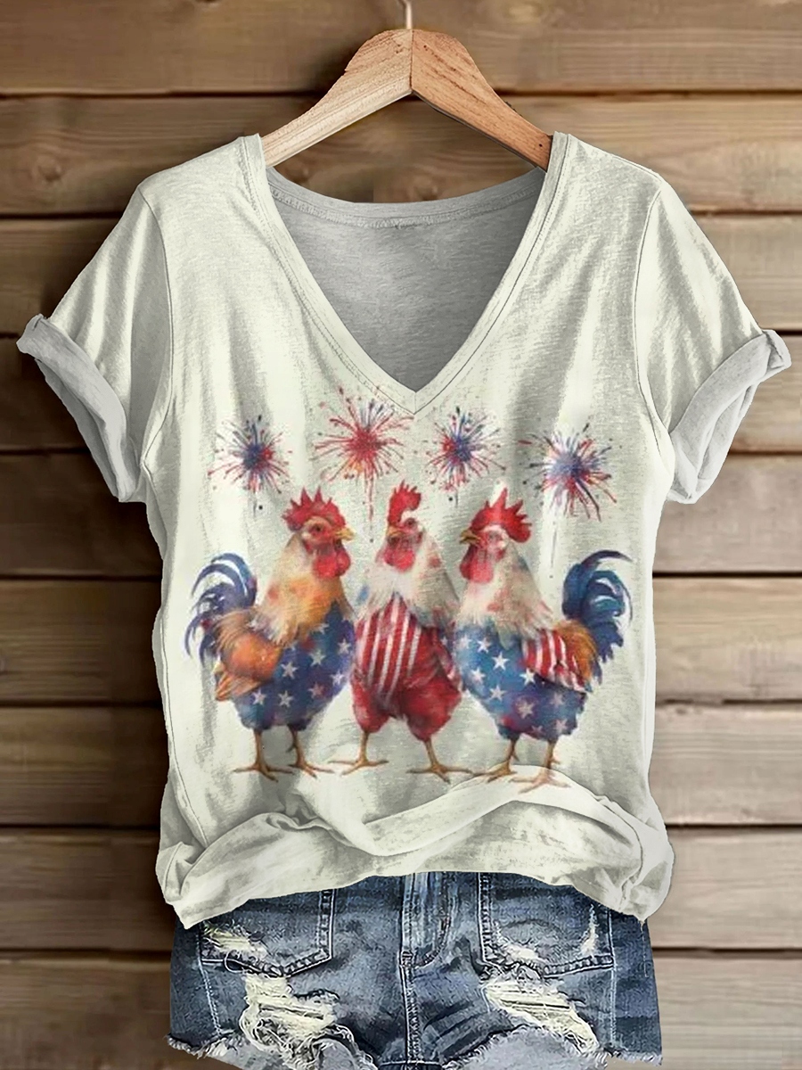 Women's Independence Day Funny Rooster Print Casual V-Neck Cotton T-Shirt