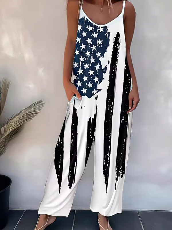 Women'S Independence Flag Print Casual Cotton Wide Leg Jumpsuit