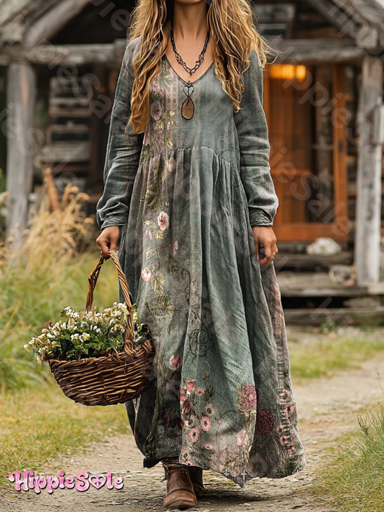 Women's Vintage Floral Art Print Long-Sleeve Cotton Dress