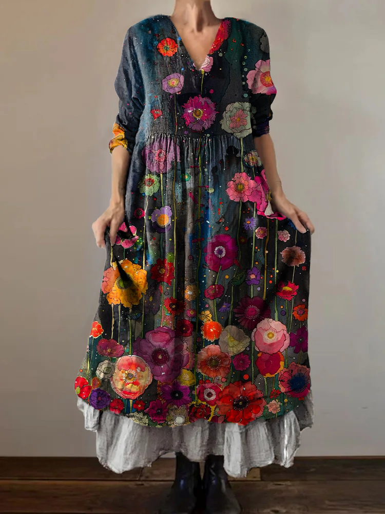 Women's Vintage Floral Art Print V-Neck Button Pocket Cotton Dress