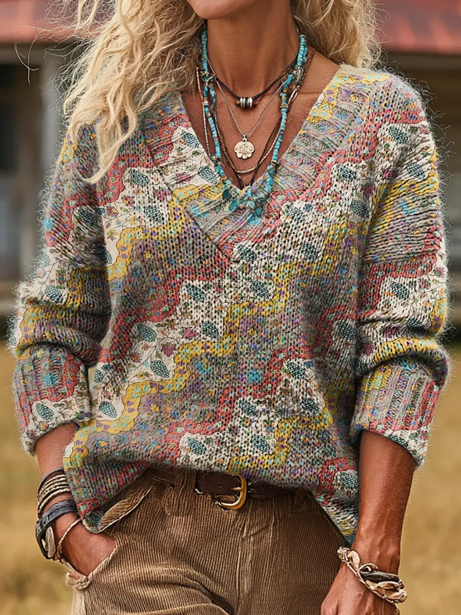 Ethnicity Geometry Flowers Arc Patchwork Women's Print V-neck Long Sleeve Sweater