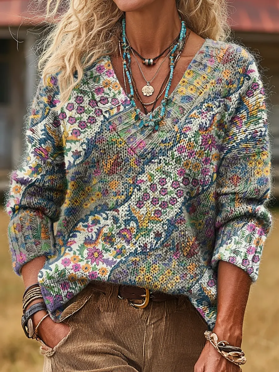 Ethnicity Geometry Flowers Colorful Women's Print V-neck Long Sleeve Sweater