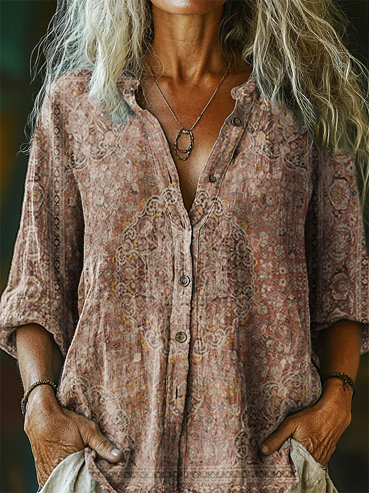 Vintage Ethnic Style Pattern Art Printed Cotton and Linen Casual Women's Shirt