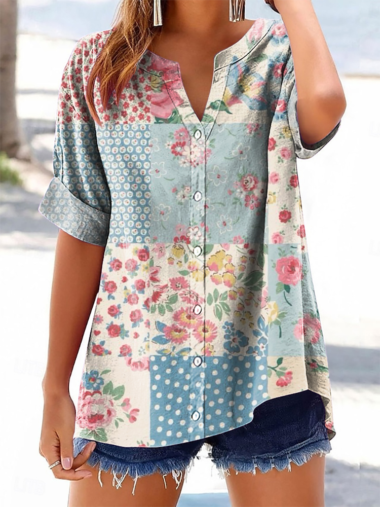Women's Vintage Floral Patchwork Art Printed Casual Short Sleeve Cotton and Linen Shirt