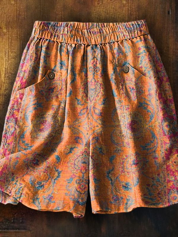 Women's Boho National Totem Art Print Casual Pocket Cotton and Linen Shorts