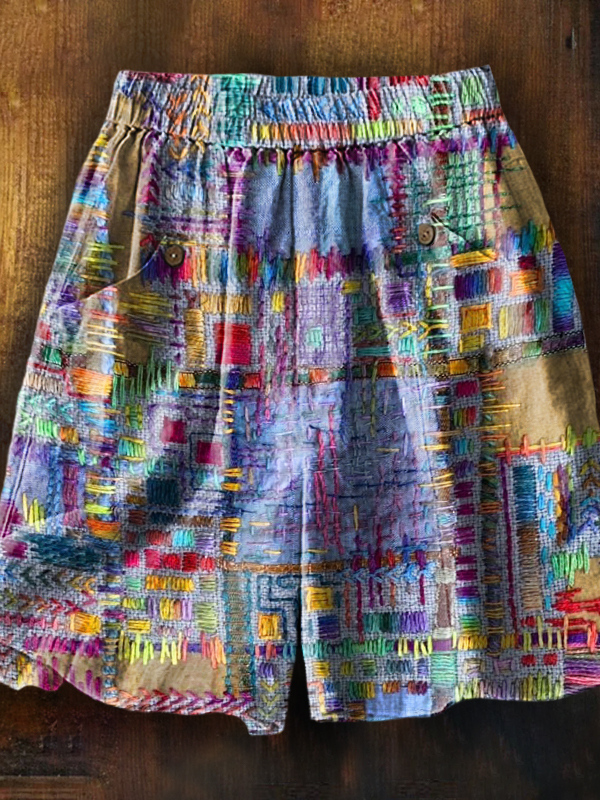 Women's Vintage Bohemian Patchwork Art Printed Casual Pocket Cotton and Linen Shorts