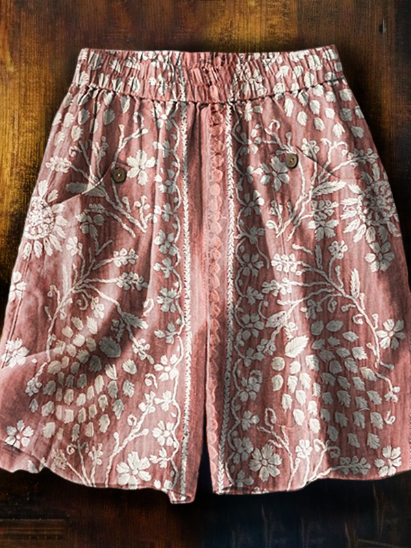 Women's Vintage Ethnic Floral Art Printed Casual Pocket Cotton and Linen Shorts