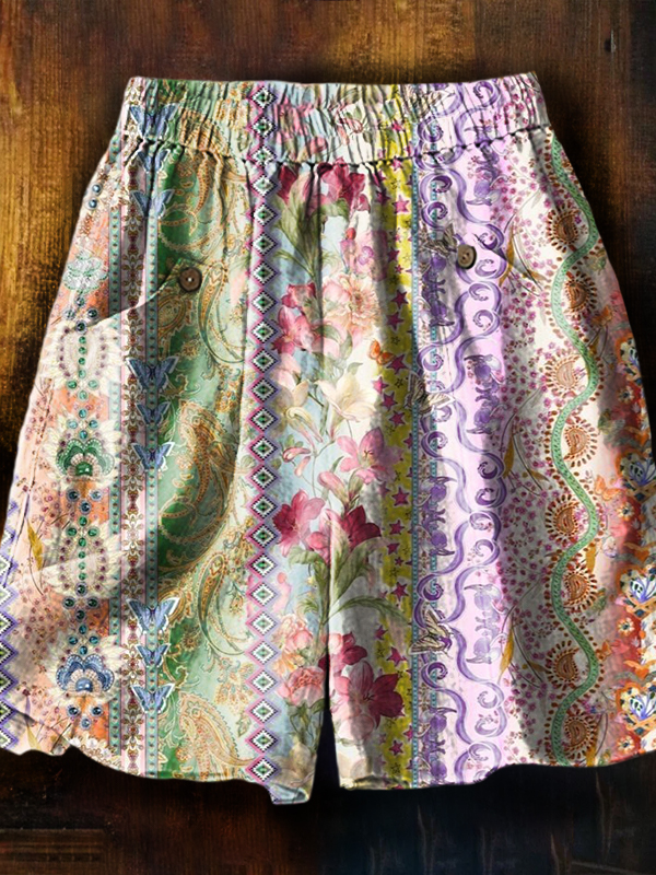 Women's Vintage Floral Art Printed Casual Pocket Cotton and Linen Shorts