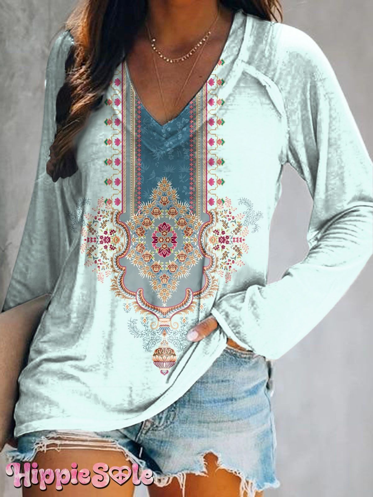 Women's Vintage Ethnic Embellished Patterns Art Printed Pockets V-Neck Cotton Dresses