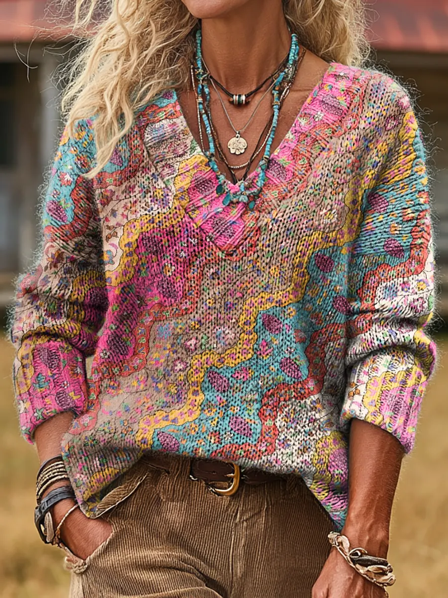 Ethnic Geometry Arc Flowers Retro Print Knit V-neck Pullover Sweater