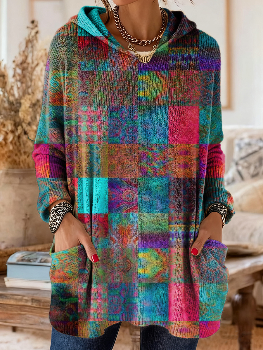 Women's Colorful Retro Patchwork Art Print Casual Long-Sleeved Hooded Cotton Knit Sweater