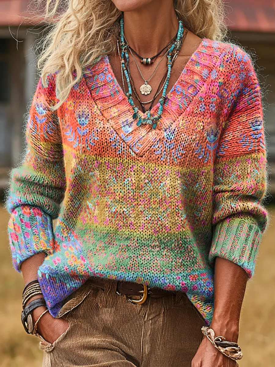 Women's Rainbow Bohemian Floral Collage Art Print Comfortable V-Neck Knit Sweater