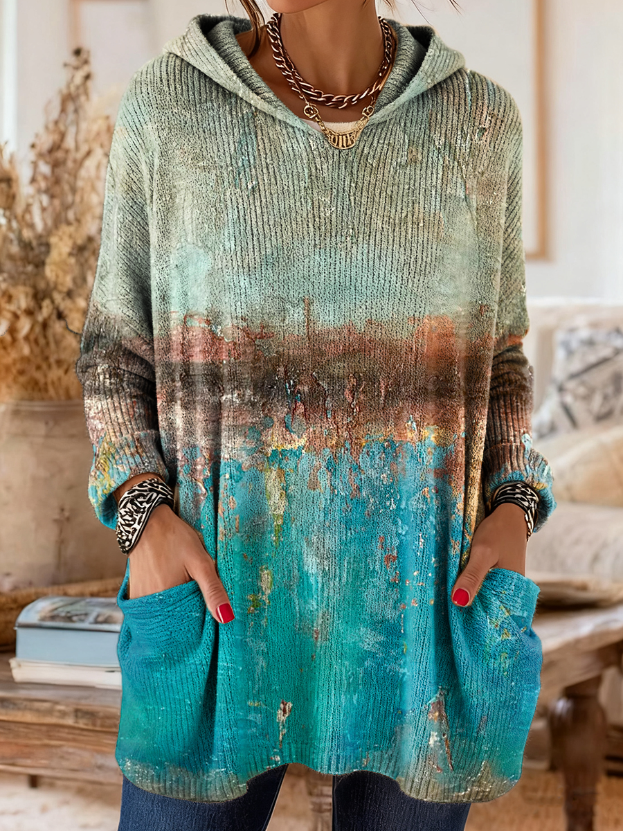 Women's Retro Art Print Casual Long-Sleeved Hooded Cotton Knit Sweater