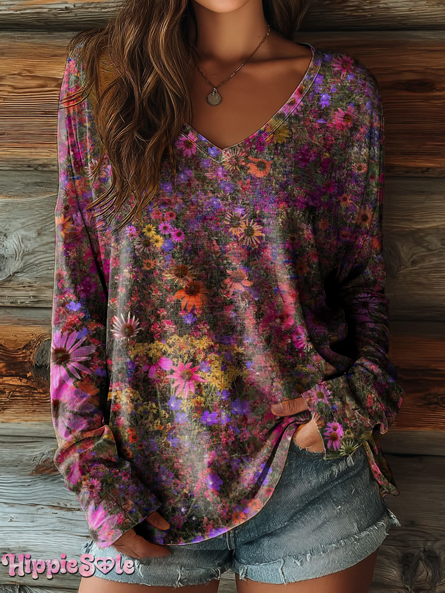 Women's Vintage Floral Art Print Casual V-neck Long Sleeve T-shirt