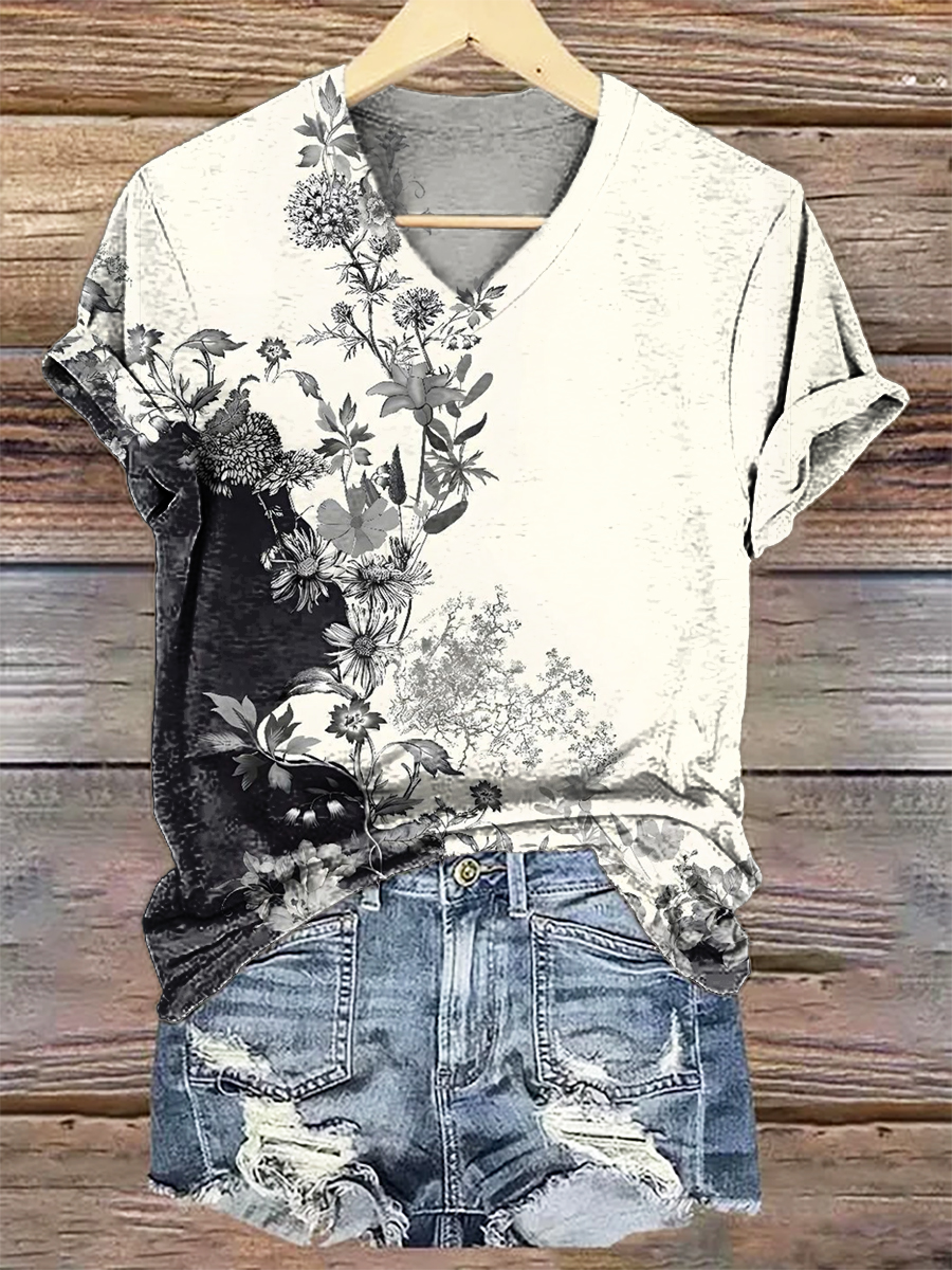 Women's Floral Art Print V-Neck Casual T-Shirt