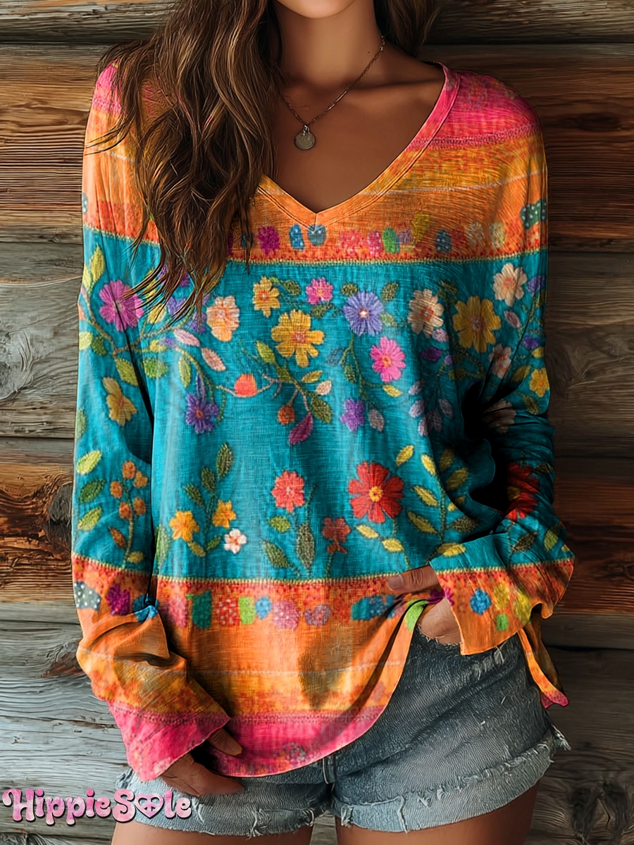 Women's Bohemian Floral Collage Art Pattern Print Casual V-neck Long Sleeve T-shirt