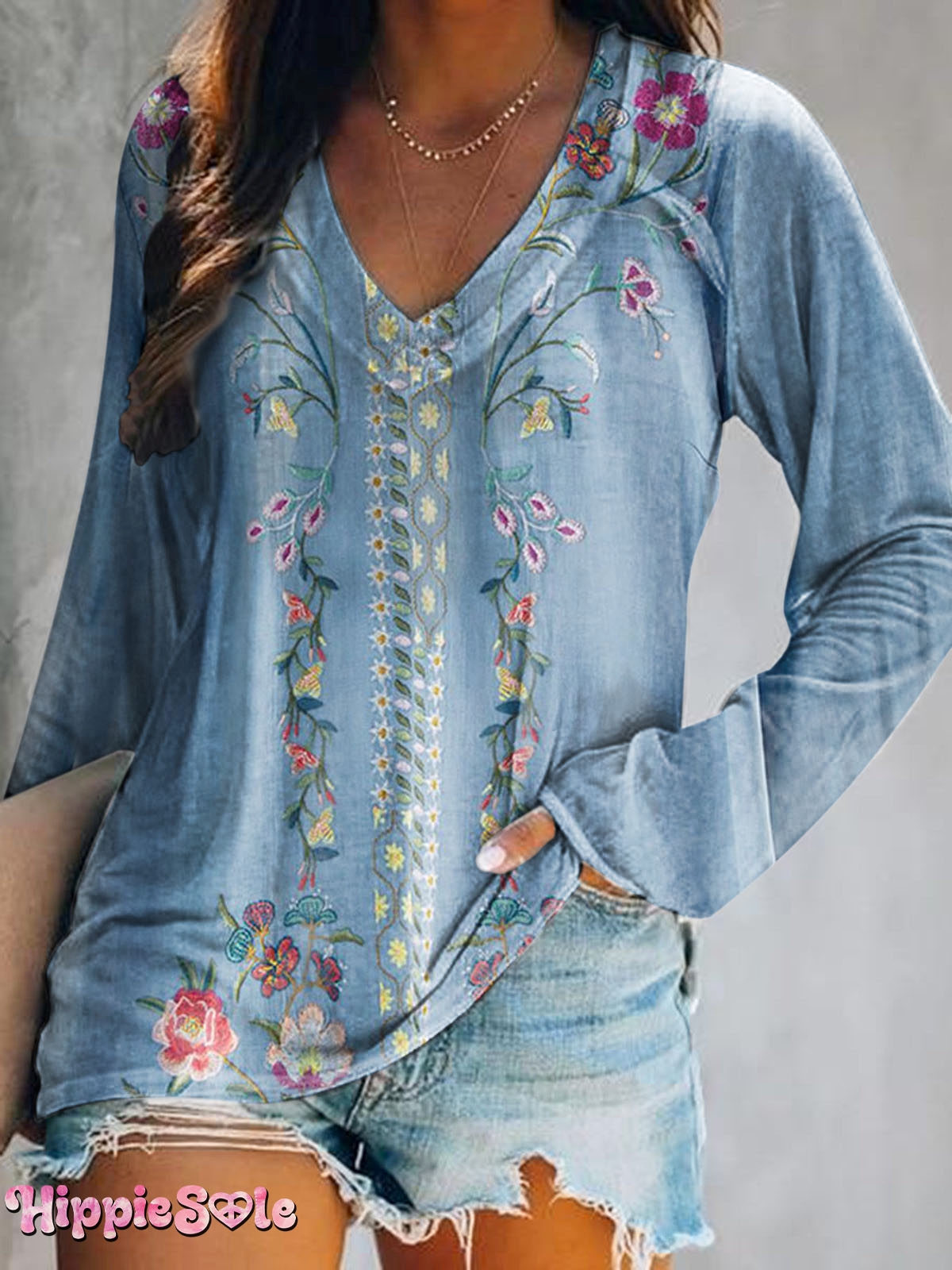 Women's Fresh Bohemian Floral Blue Art Print Casual V-neck Long Sleeve Top