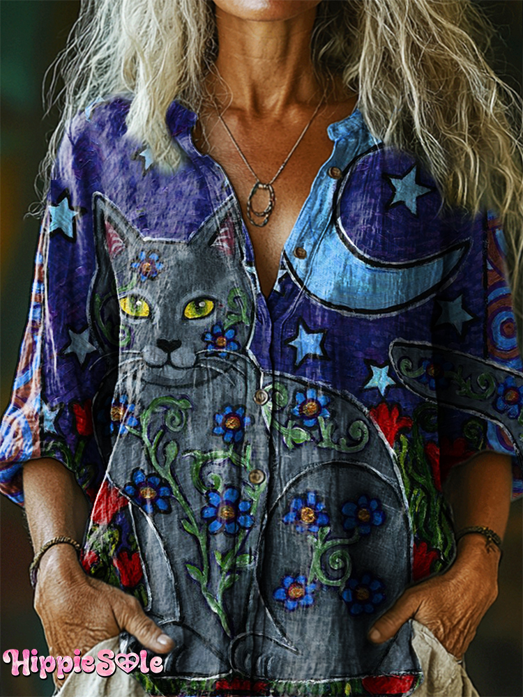 Women's Vintage Floral Cute Cat Art Print Casual Cotton Linen Shirt