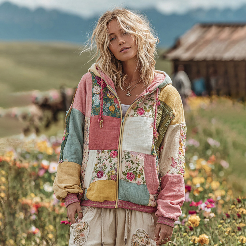 Women's Vintage Floral Patchwork Cozy Warm Zipper Hoodie