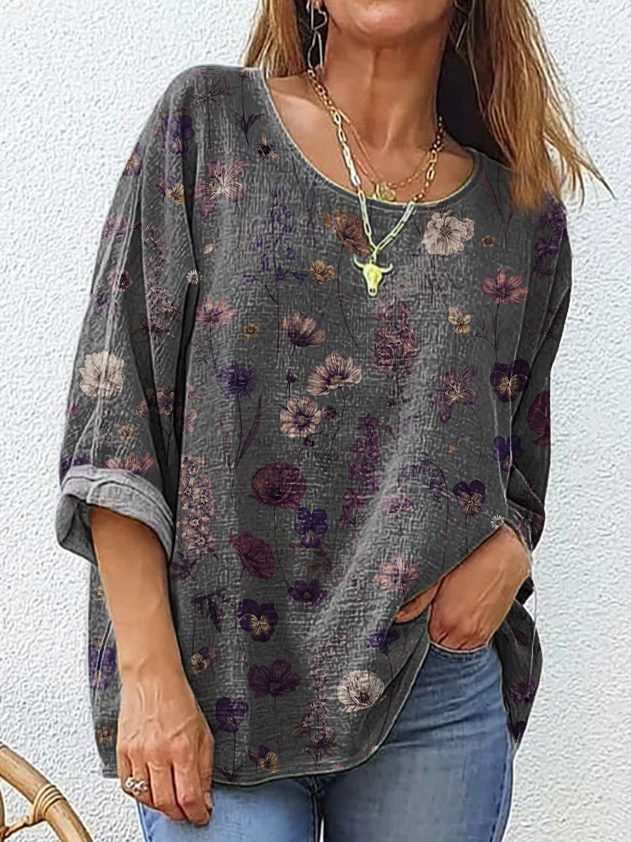 Women's Vintage Floral Art Print Casual Cotton And Linen Shirt