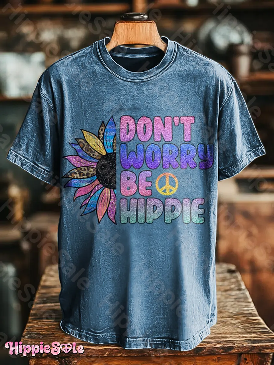 Don't Worry Be Hippie Flowers Bright Unisex Vintage Art Print Casual T-shirt