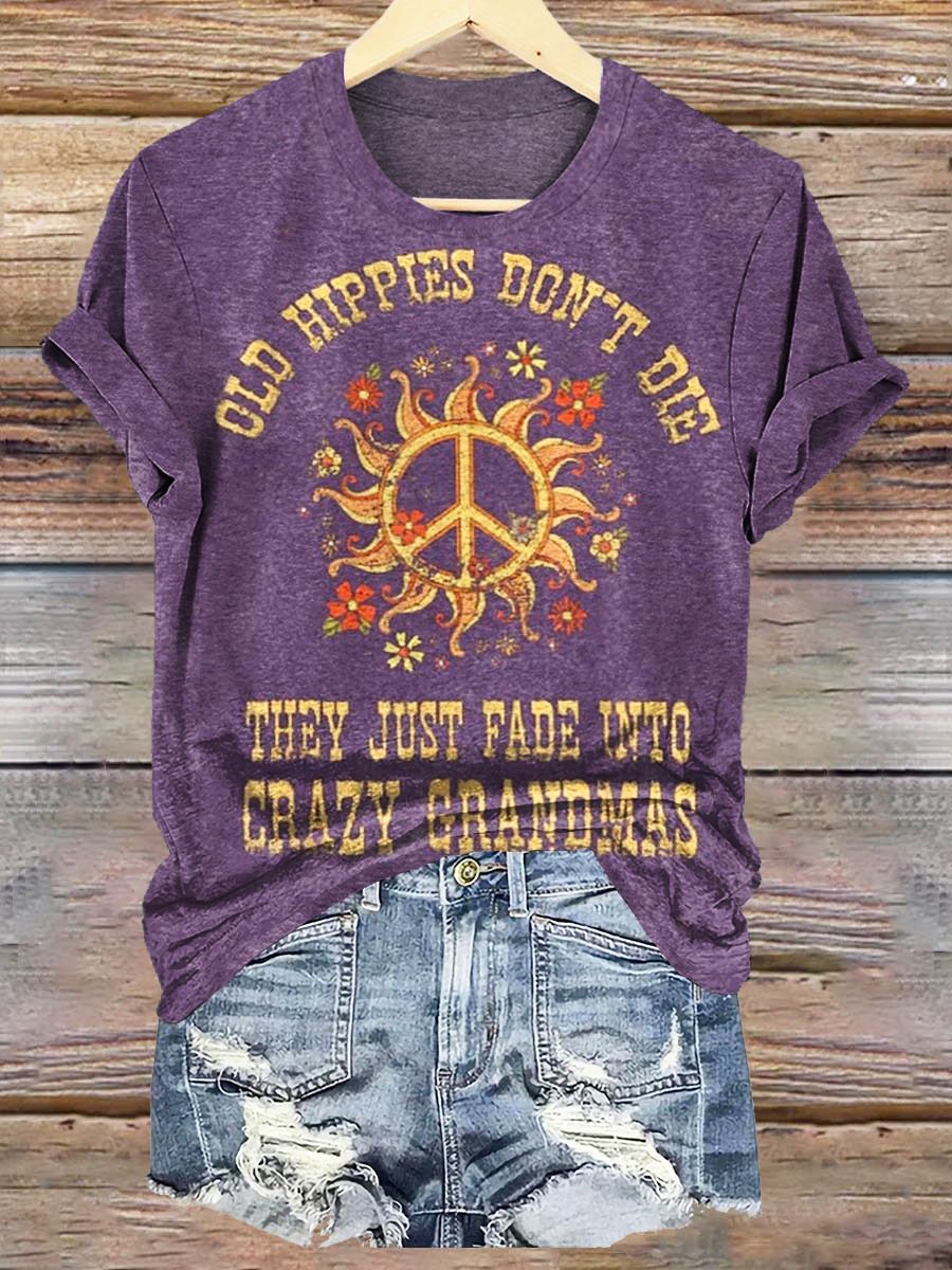Women's Old Hippies Don't Die They Just Fade Into Crazy Grandmas Print Crew Neck T-shirt