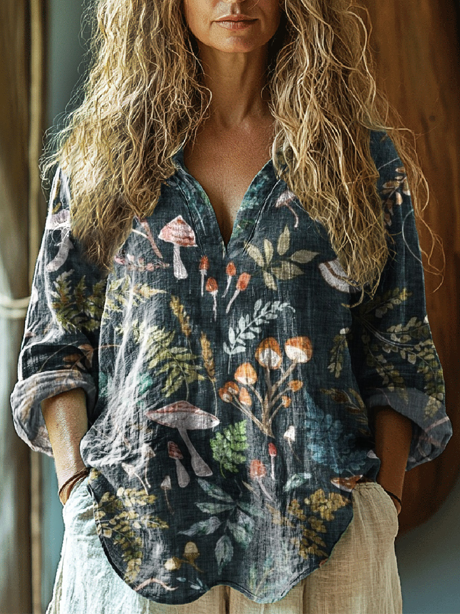 Women's Retro Mushroom Grove Art Print Casual Linen V-neck Shirt