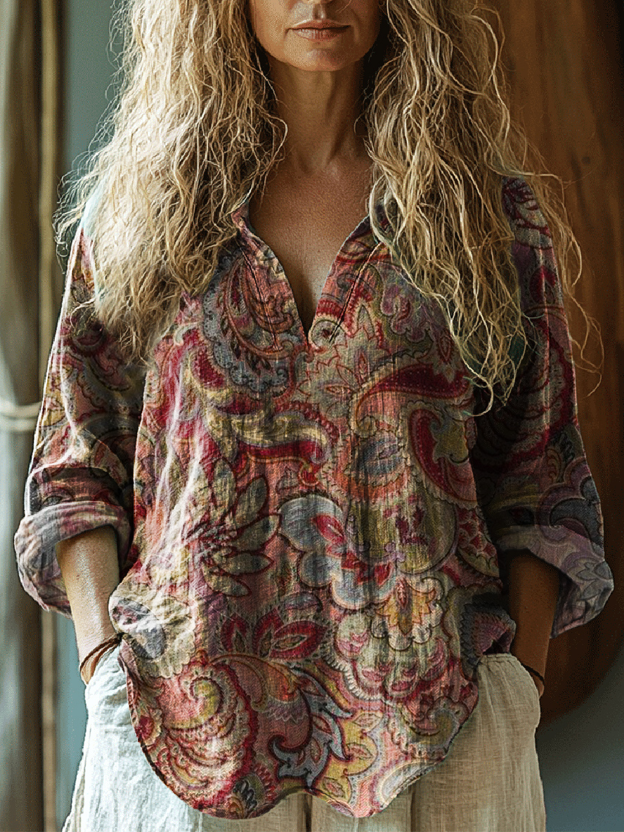 Women's Vintage Floral Print Casual Linen V-Neck Shirt