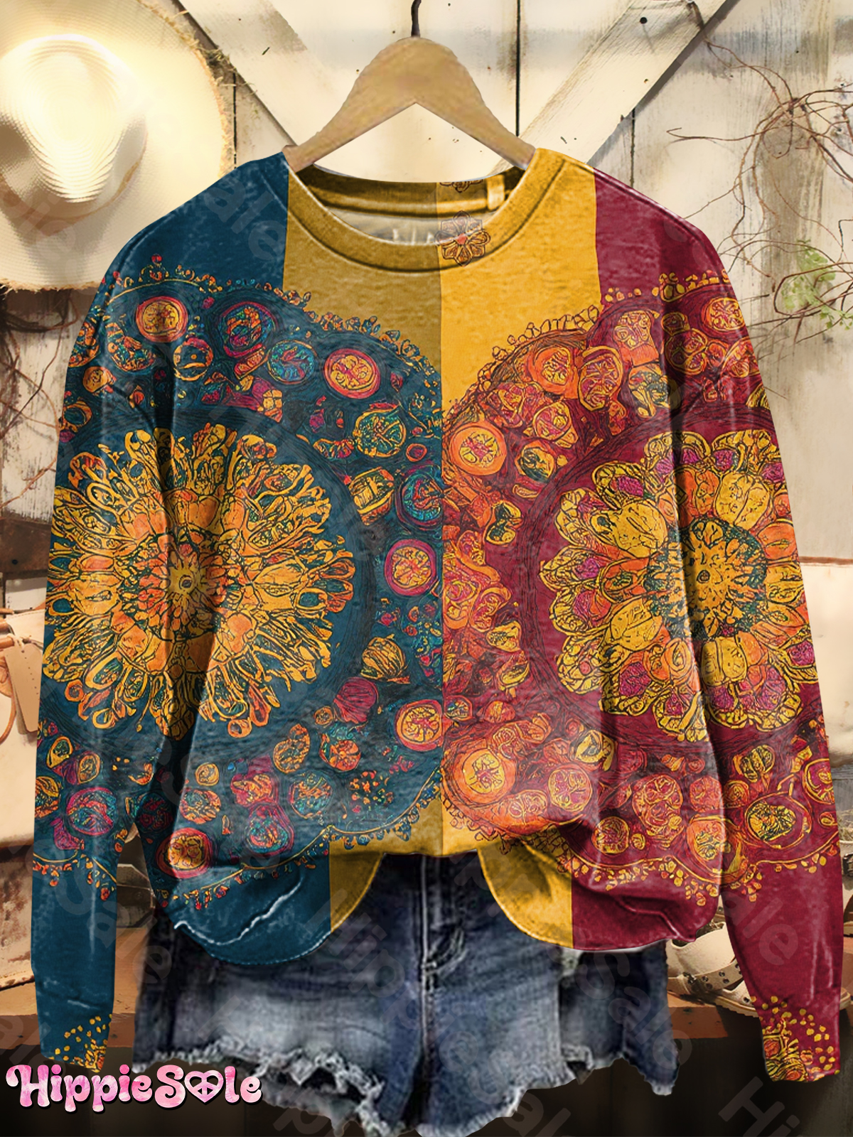 Women's Colorful Retro Mandala Flowers Pattern Art Print Casual Crew Neck Sweatshirt