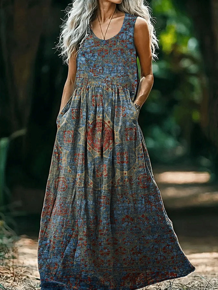Women's Ethnic Art Print Round Neck Sleeveless Cotton Pocket Dress