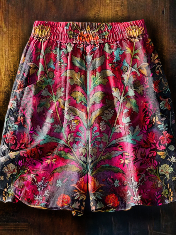Women's Vintage Ethnic Floral Art Printed Casual Pocket Cotton and Linen Shorts